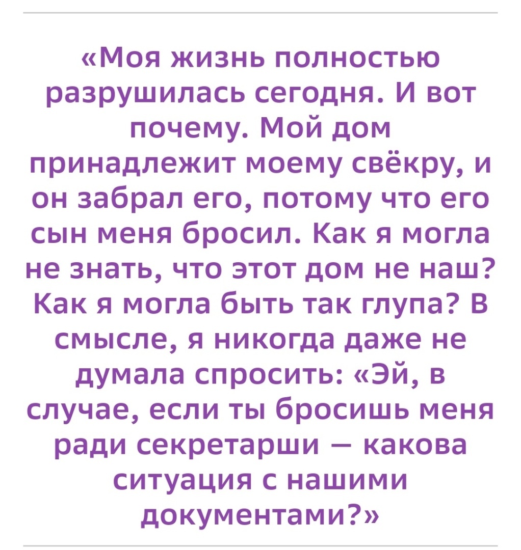 Вывод очевиден: покупая квартиру или любое другое имущество, позаботьтесь, чтобы право собственности на него было оформлено и на вас тоже, а брачный договор давно заключают не только звёзды шоу-бизнеса и миллионеры.