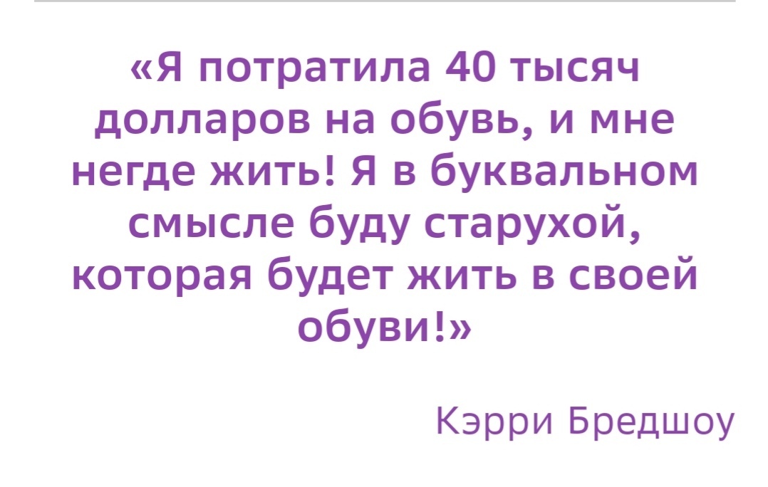 Откладывать часть дохода и иметь финансовый план, в том числе на несколько лет вперёд. Остальные героини сериала не стесняются копить деньги и приобретают квартиры, пока Керри скупает туфли и платья в кредит. А когда сценаристы ставят героиню перед выбором: выкупить любимую квартирку или съехать из неё, оказывается, что банки не дают ей как фрилансеру кредит, так как у неё нет накоплений.