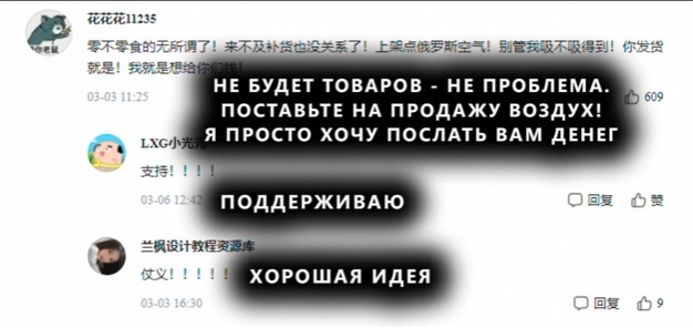 Но мы говорим не только о политике, китайские граждане искренне пытаются помочь России, скупая все наши товары в своих магазинах и заказывая их из России онлайн.