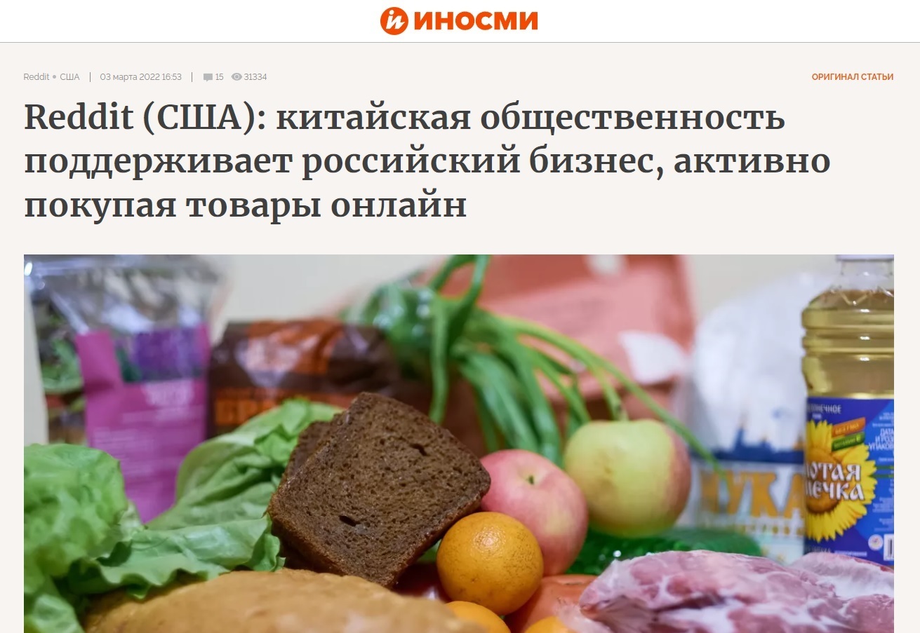 "Ранее в Telegram-каналах появилась информация о том, что китайские покупатели скупают российские продукты питания в интернет-магазинах КНР в знак поддержки российского бизнеса в контексте сложной геополитической и экономической ситуации".
