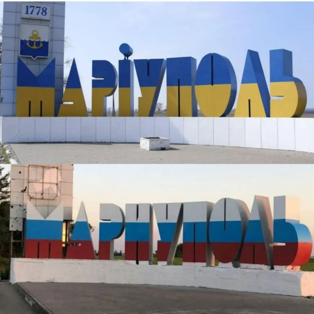Стелу на въезде в Мариуполь перекрасили в цвета российского флага