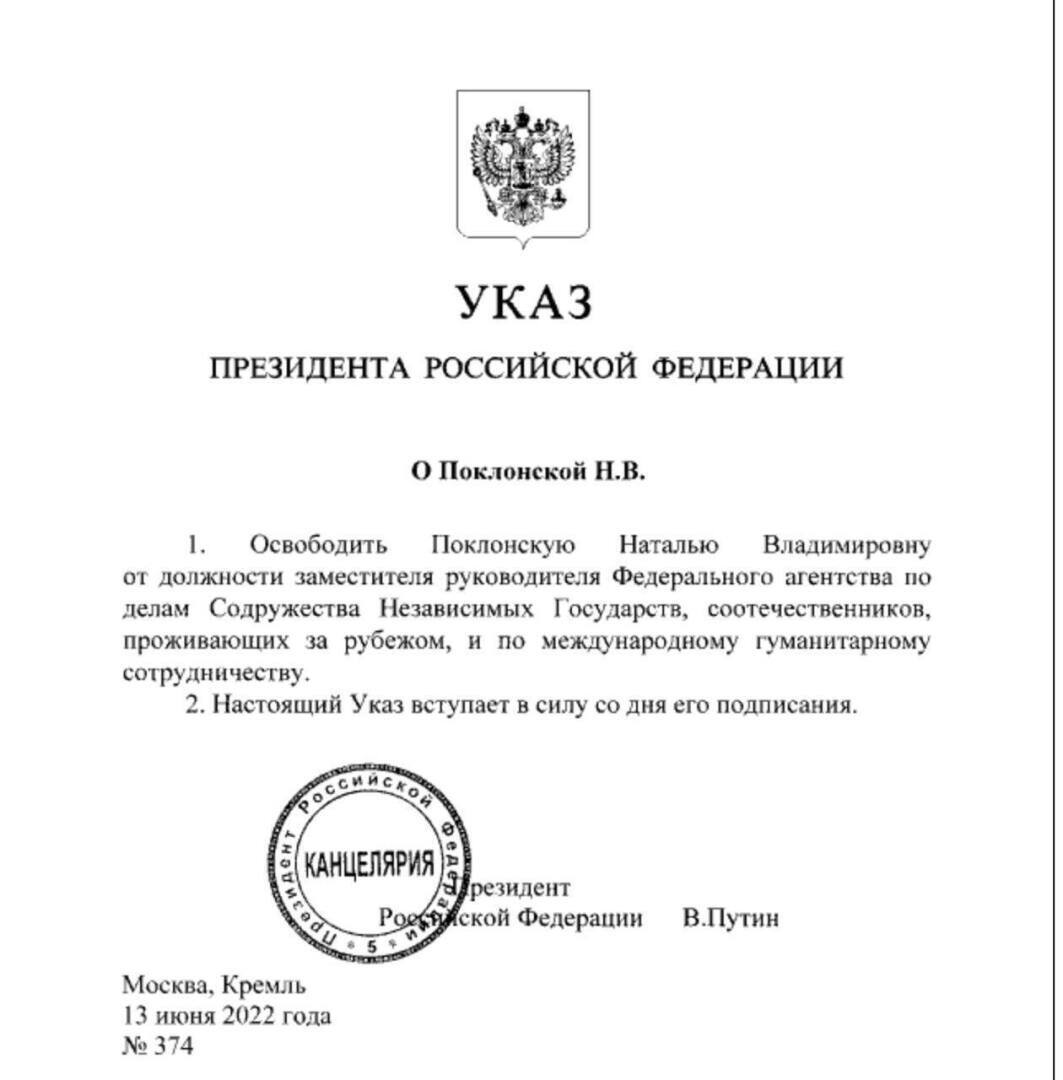 ⚡️Путин уволил с поста главы Россотрудничества бывшего прокурора Крыма Наталью Поклонскую.