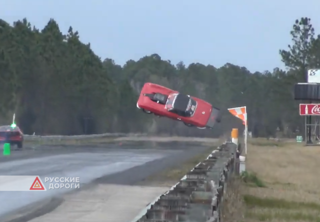 Вот это гонки,Вау:Один из участников заезда драг-рейсинга ушел в свободный полет.