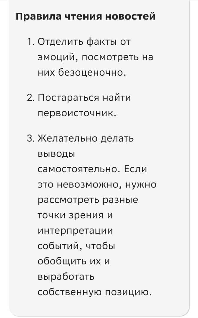 Но на самом деле это не так просто. Мы реагируем на любую информацию в первую очередь эмоционально, а осмыслить её можем только тогда, когда эмоциональная реакция схлынула. И это нормально. Поэтому ограничивать чтение новостей всё же полезно, но важно помнить и о том, что само по себе такое ограничение не сможет избавить от тревоги.