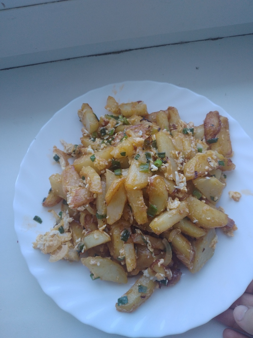 Очень вкусный и полезный еда на обед. Картошка жарить с яйцом и зелёный луком.