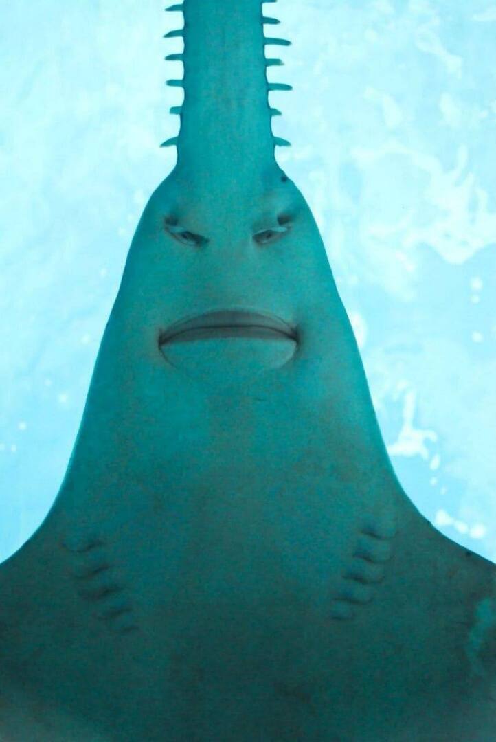 Взгляд рыбы пилы с низу. Данный вид относится к семейству скатов, максимальная длинна выловленной особи достигала 7 метров и вес достигал до 300 килограммов.