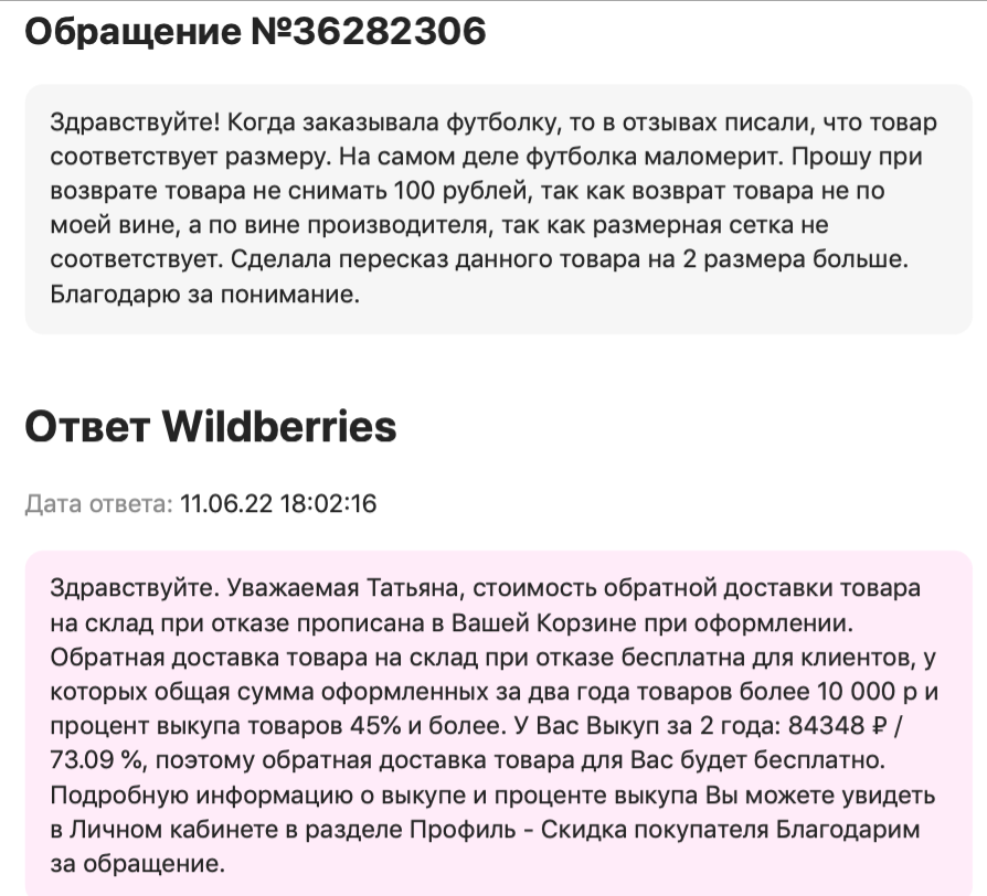 Почти месяц в Интернете муссируются слухи о списании 100 рублей в случае возврата товара на Wildberries. Поддавшись им, я написала обращение в личном кабинете Wildberries о несписании этих денег.