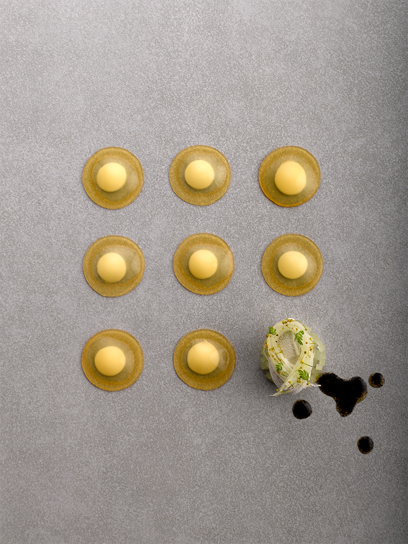 Поместите огуречный брюнуаз и полоски жульена поверх нижних правых «равиоли». Подавать немедленно.