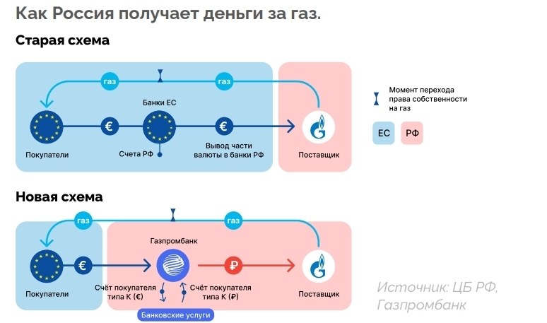 3 Россия принимает платежи за газ в рублях. По новой схеме оплаты валюта меняется на рубли на бирже, в основном это евро, в меньшей степени - доллары. Оплата рублями позволила России избежать блокировки получаемых денег и укрепила курс рубля.