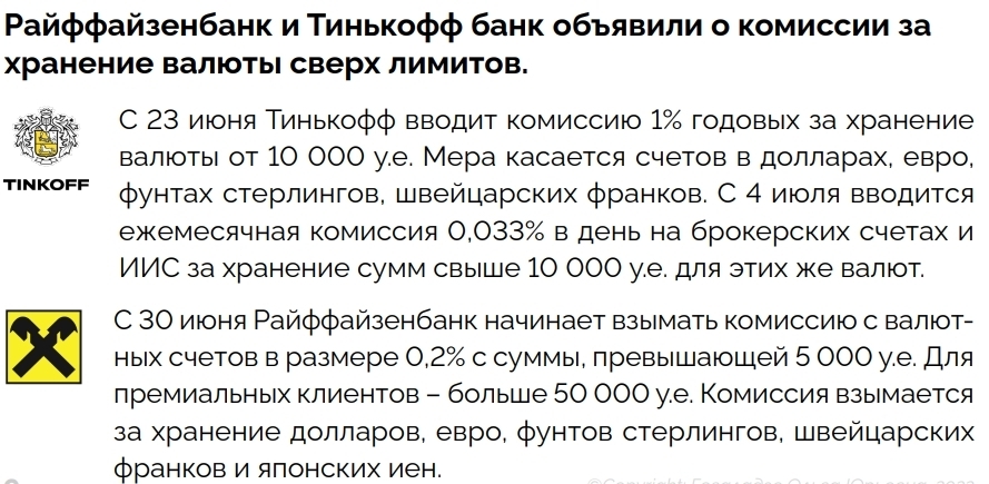 В текущих условиях у него есть один большой минус – снять валюту не получится до 9 сентября, а может и дольше. Купленная валюта будет лежать на счете без дела, а снять ее можно будет только после отмены ограничений. Некоторые банки начали вводить комиссии за хранение валюты на банковских и брокерских счетах.