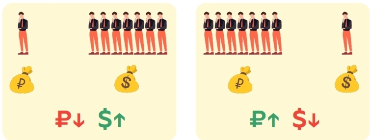 • Если высокий спрос на валюту, она укрепляется. Это значит, что ее цена растет, а цена рубля падает.