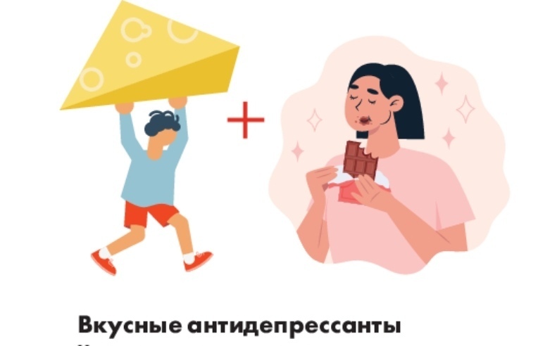 Но не только цвет продукта делает его антидепрессан том. Важную роль играет также состав. Список продук ТОВ «Для настроения» обычно возглавляет шоколад: он богат магнием, который необходим для выработки эндорфинов. А еще в нем много углеводов, поэтому мозг быстро получает порцию энергии, позволяя человеку взбодриться. Но полезен только горький шоколад: содер жание какао-бобов в нем должно быть минимум 78%. Усилить действие шоколада поможет сыр, который в не сколько раз увеличивает чувствительность к эндорфи нам. Ученые полагают, что сочетание этих двух продук тов может позитивно сказаться даже на состоянии людей, страдающих депрессией. Ну а тем, кто просто не много захандрил, такой продуктовый набор быстро под нимет настроение.