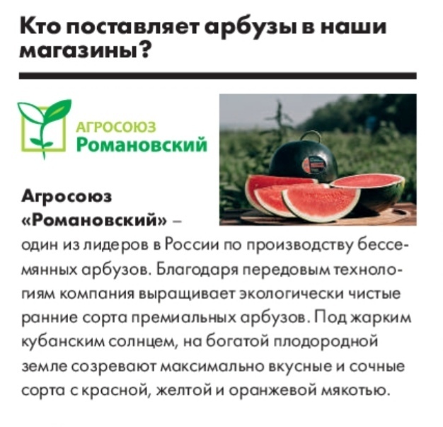 Один из ведущих российских производителей бахчевых куль тур находится в Соль-Илецком районе на юге Оренбургской области. Компания выращивает более 30000 тонн арбузов, как классических, так и экзотических. Вся бахчевая продукция реализу ется через Федеральные сети под собственным товарным знаком.