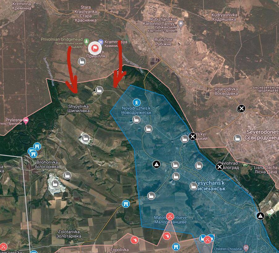 Силы РФ и их союзники взяли под свой контроль Привилль (Приволье), успешно переправившись вчера через реку Северский Донец! Переправа была по понтонному мосту. Это означает, что последняя дорога отступления из Лисичанска отрезана!