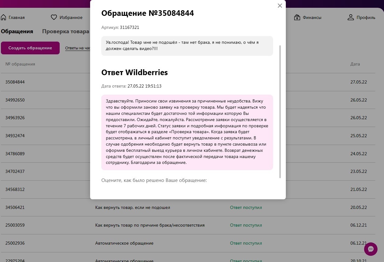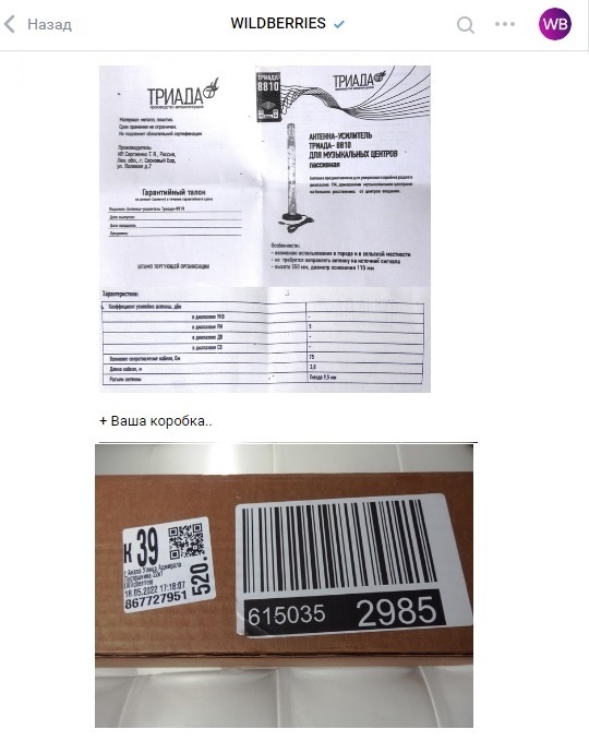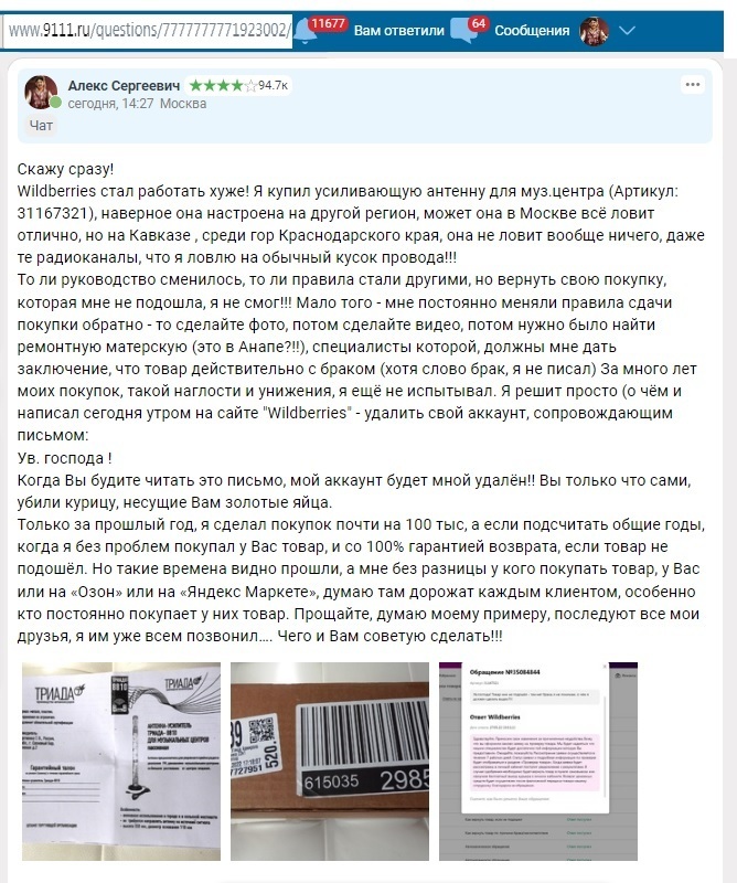 То ли руководство Wildberries сменилось, то ли правила стали другими, но вернуть свою покупку, через 15 мин приобретения, которая мне не подошла, я не смог!!! Мало того - мне постоянно меняли правила сдачи покупки обратно - то сделайте фото, потом сделайте видео, потом нужно было найти ремонтную матерскую (это в Анапе?!!), специалисты которой, должны мне дать заключение, что товар действительно с браком (хотя слово брак, я не писал) Короче делали всё, чтобы я от них отстал!! Целый месяц мы переписывались с руководством Wildberries, и на сайте самой компании, и ВКонтакте. Я Решил – что эти 1300 руб за приобретённую антенну, не стоят моей нервной системы. За много лет моих покупок, такой наглости и унижения, я ещё не испытывал. И решил просто (о чём и написал на сайте "Wildberries" - удалить свой аккаунт, сопровождающим письмом: