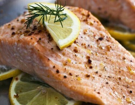 Поместите лосося в подготовленную сковороду. Слегка смажьте маслом и приправьте с обеих сторон солью и перцем. Добавьте травы и полейте лимонным соком сверху