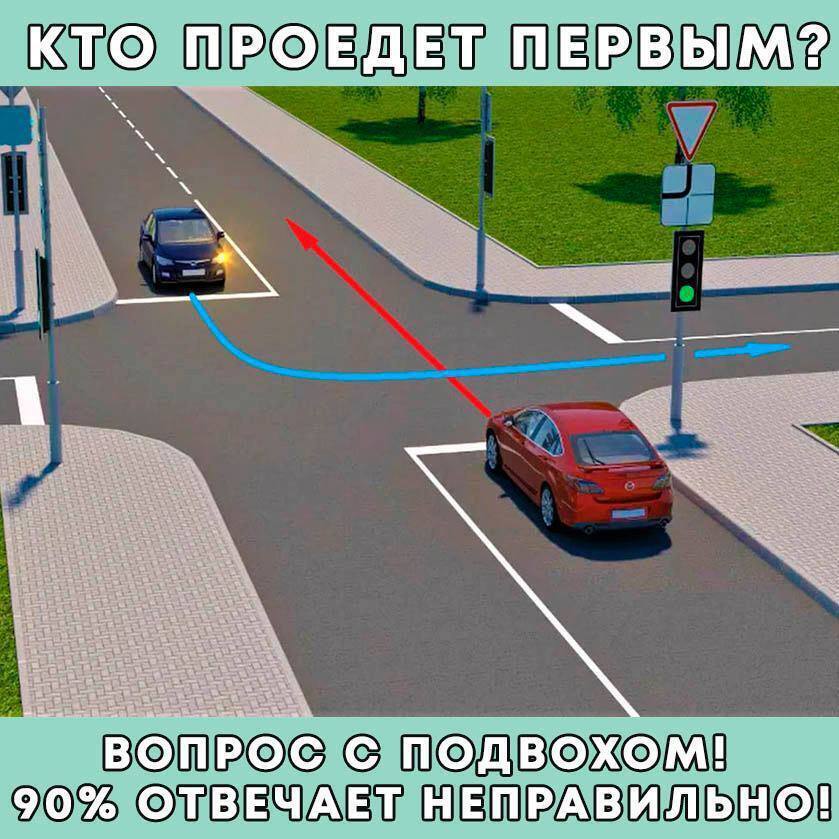 Если бы светофор мигал жёлтым или не работал, то первым должен был проехать синий автомобиль.