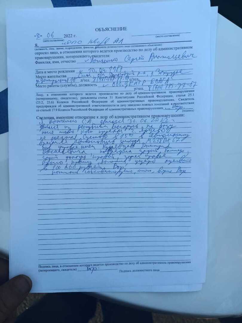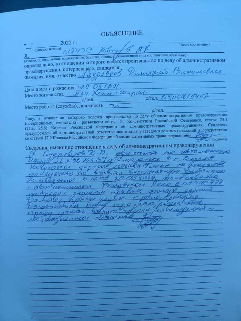 Вину признаю полностью, раскаиваюсь, прошу учесть 2-ю группу инвалидности и мое болезненное состояние! Обьяснение виновника ДТП от 30.06.2022
