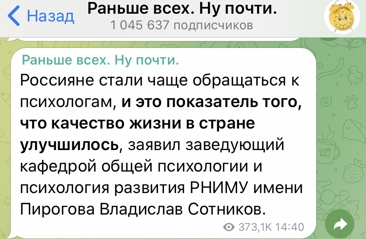 "Врачу, исцелися сам!" Именно эти слова хочется адресовать нашим современным психологам, многие из которых годятся разве что в герои анекдотов. Лично у меня ни один их них не вызывает элементарного доверия, достаточно на них посмотреть. Они стали частыми гостями различных телепередач, но ни к одному из них я бы не пошла на приём. К счастью, мне и не требуется их помощь, а ведь есть реально нуждающиеся пациенты. Теперь о том, что в стране "реально стали жить лучше", поэтому и зачастили к психологам. Где логика? Если человеку хорошо во всем, он в последнюю очередь вспомнит о враче, тем более, этой специализации. Возможно, у представителей элиты стало престижно посещать "домашних психологов", так это дань моде, и только. Учитывая резко возросшие тарифы на предоставление различных услуг, простой народ не ломанется за призрачной "помощью", которая может обойтись в половину зарплаты, и это за один визит. Нет уж, мы по старинке сами решаем свои проблемы.