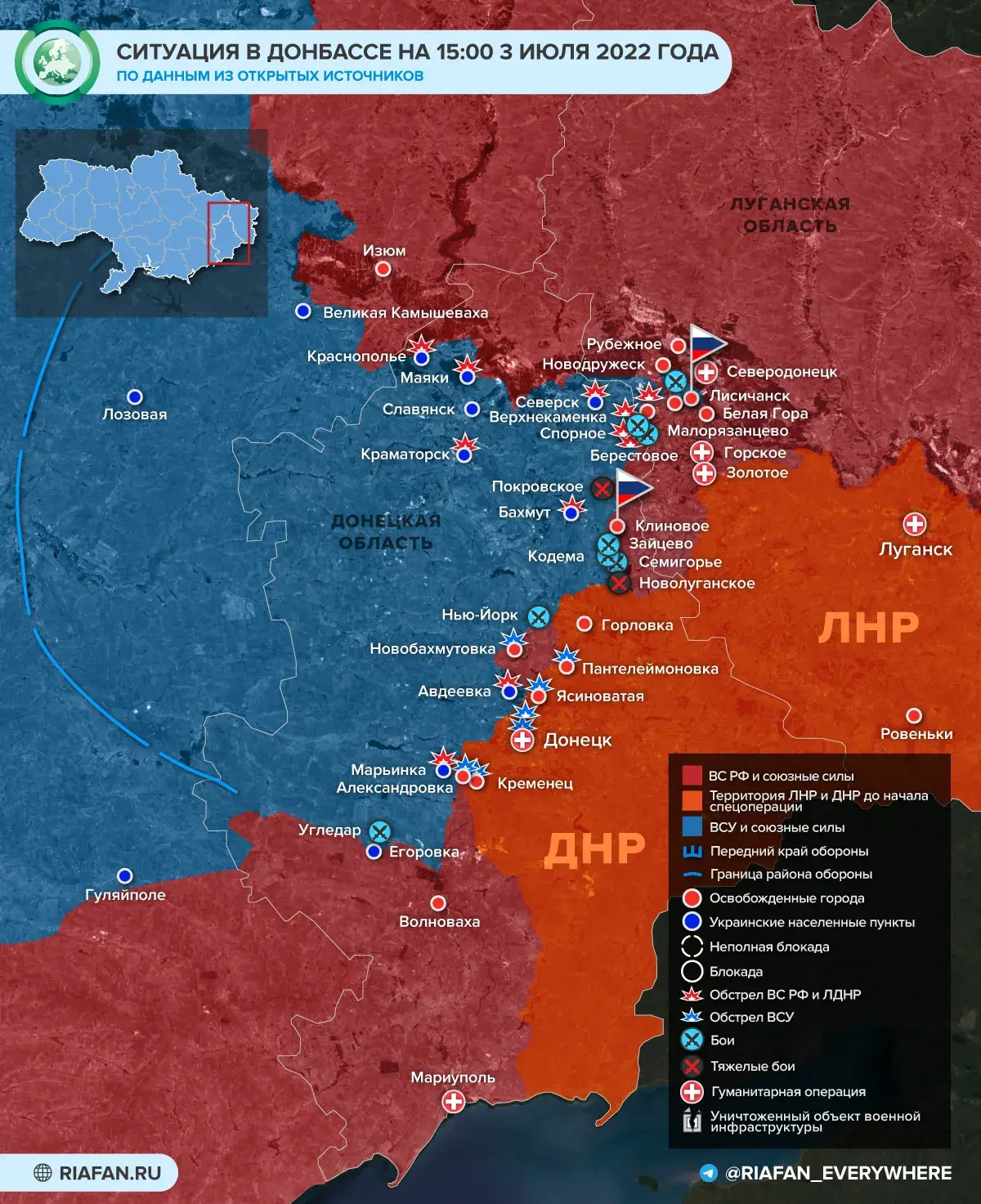 На брифинге Минобороны России сообщило об освобождении самых крупных населенных пунктов. 38 солдат ВСУ сдались около Лисичанска за последние два дня. Большая часть из них является местными жителями мобилизованных насильно на под контрольных Киевскому режиму территориях. При отступлении боевики бросают технику, оружие, так любезно предоставленное их покровителями на Западе при этом они несут большие потери.