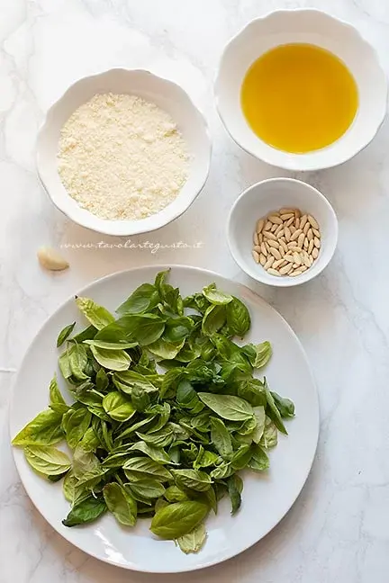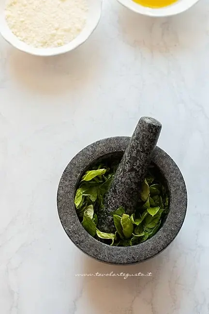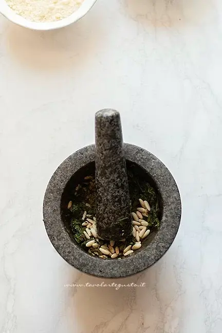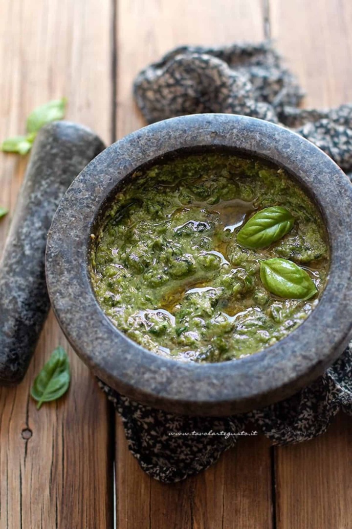 Как и любой классический рецепт, Существует несколько вариаций: с добавлением рикотты, с использованием орехов вместо кедровых орехов. Другие вместо этого, чтобы ускорить практику, готовят песто в блендере; если у вас нет инструмента, вы также можете это сделать, но помните, что лезвия окисляют листья, нагревают смесь, и зернистая текстура, типичная для традиционного измельчения, теряется!