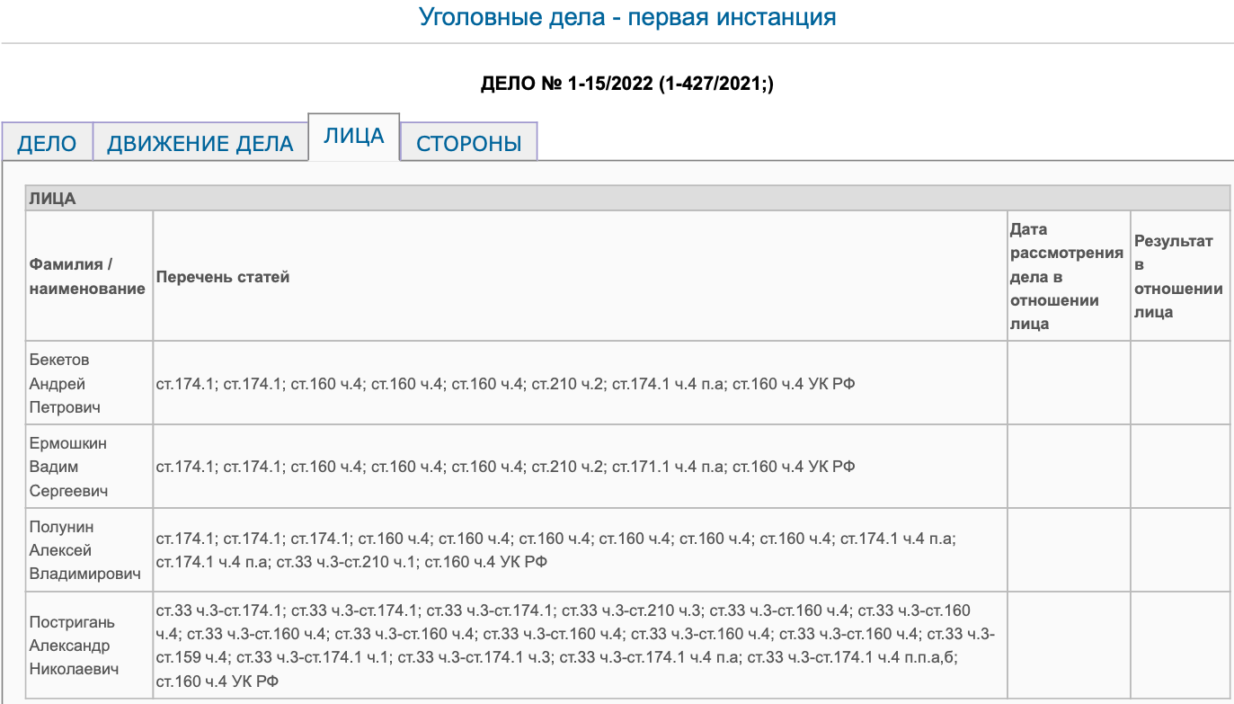 Этим дело не закончилось. В августе 2021 году в Клинский городской суд Московской области поступило новое уголовное дело в отношении Александра Постриганя и его подельников.
