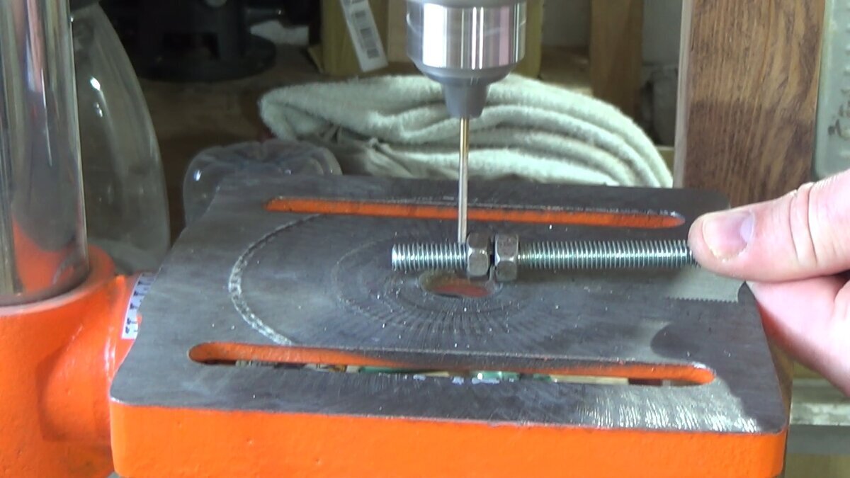Теперь нужно накрутить гайку на шпильку, ну где-то 5-6 см. от края. И у края гайки, как на фото ниже, просверлить отверстие в шпильке, диаметр сверла берем чуть больше диаметра тросика.