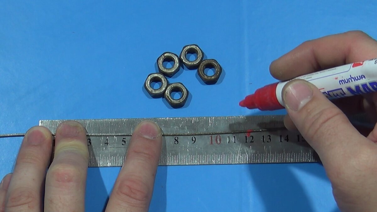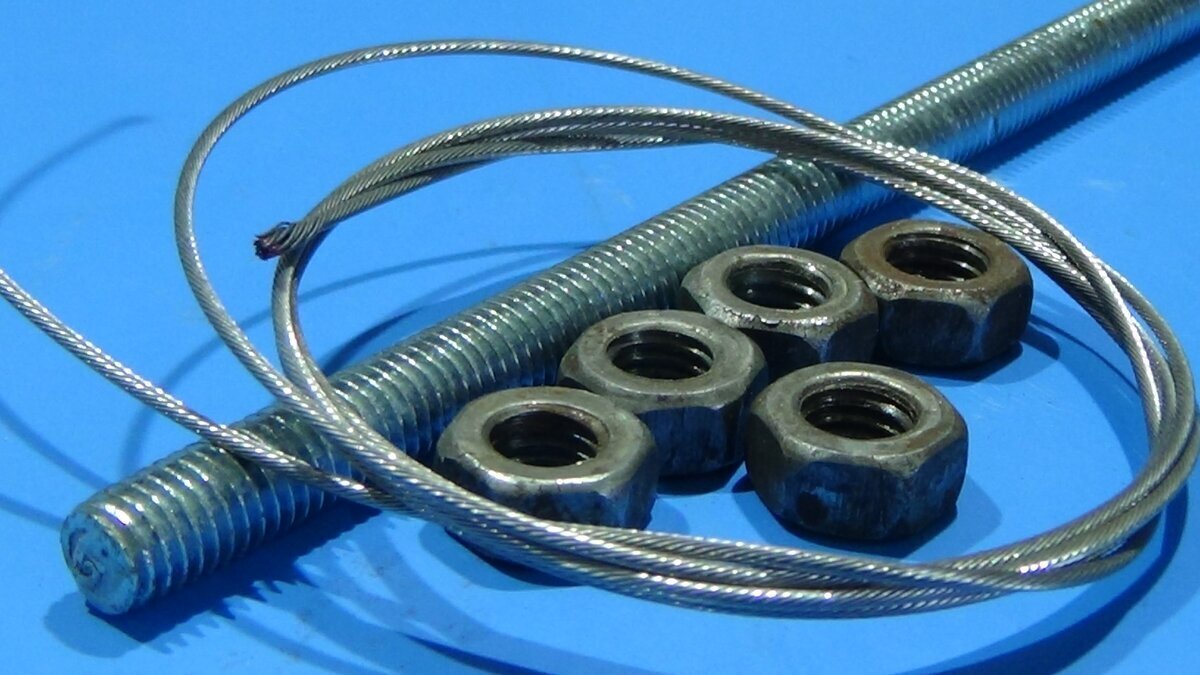 Для самоделки мне понадобиться всего три разных компонента. Это шпилька, гайки с резьбой к этой шпильке и тросик, я взял порванный от велосипеда.