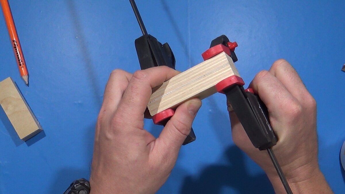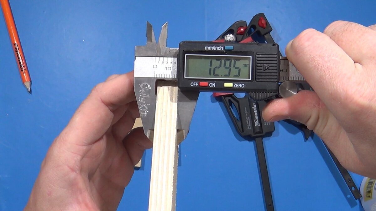 На большом прямоугольнике клей уже подсох. На этой детали ищу середину и отмечаю ширину линейки которая в дальнейшем будет фиксироваться в рейсмусе.