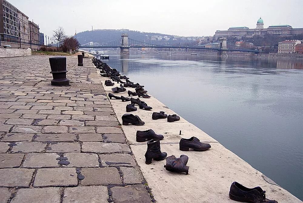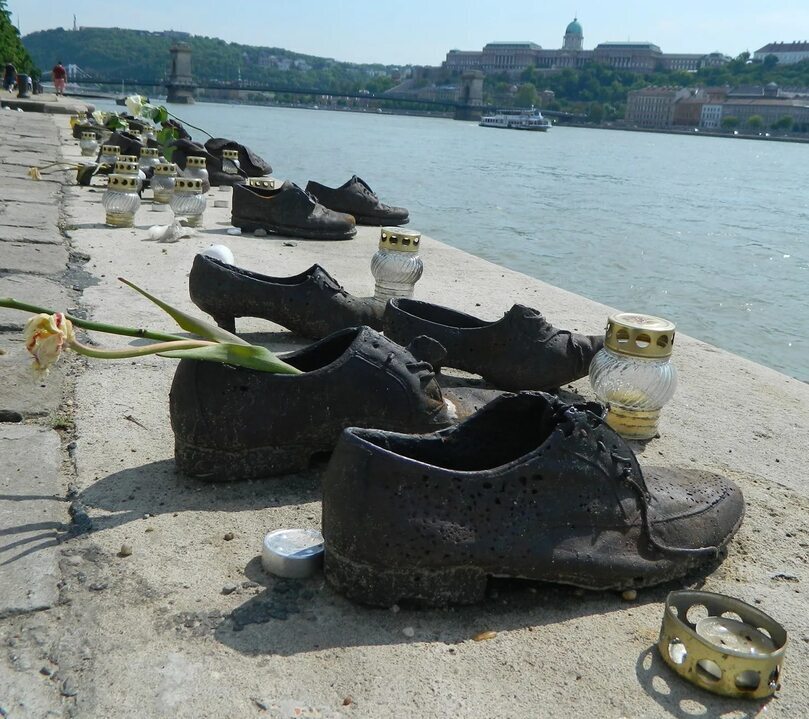 "Ту́фли на на́бережной Дуна́я (венг. Cipők a Duna-parton) — мемориал жертвам Холокоста, установленный в 2005 году на берегу Дуная в Будапеште. Массовые расстрелы евреев в Будапеште производились членами венгерской нацистской партии «Скрещённые стрелы» в конце Второй мировой войны, в 1944 — начале 1945 годов. Чтобы не заниматься захоронением, нацисты расстреливали жертв на берегу реки, для экономии пуль связывая им руки или ноги и стреляя только в первого — падая, он тянул за собой остальных."