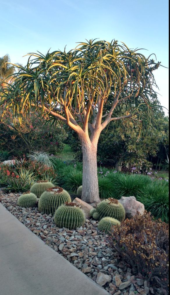 Теплолюбивое южноафриканское древовидное алоэ ( Aloe bainesii ) окружено большими камнями, скалами и гравием, а также золотым бочковым кактусом в этом саду, спроектированном Succulent Designs LA . Алоэ и другие суккуленты создают естественную красивую обстановку. Это многоветвистое дерево с массивным стволом хорошо смотрится в средиземноморских садах. Несмотря на то, что это растение быстро растет и устойчиво к засухе, алоэ любит воду и хорошо дренированную почву, а также компост.