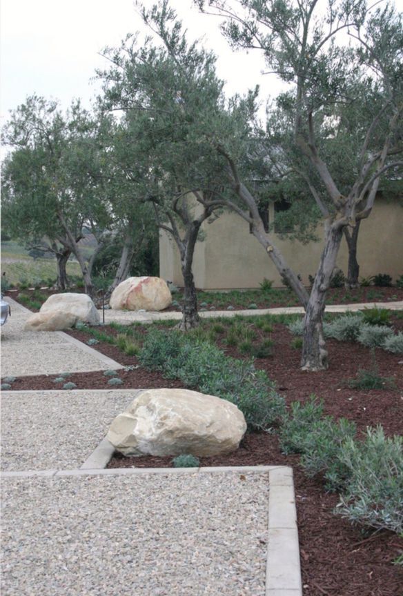 Оливковые деревья в доме с виноградником в Калифорнии засажены сеслерией 'Гринли', олеей 'Литтл Олли', вестрингией кустарниковой 'Смоки' и полынью 'Выбор Дэвида'. Эта подъездная дорожка, спроектированная Carson Douglas Landscape Architecture , была замульчирована местным красным деревом. Валуны из песчаника Санта-Барбары добавляют текстурный интерес.