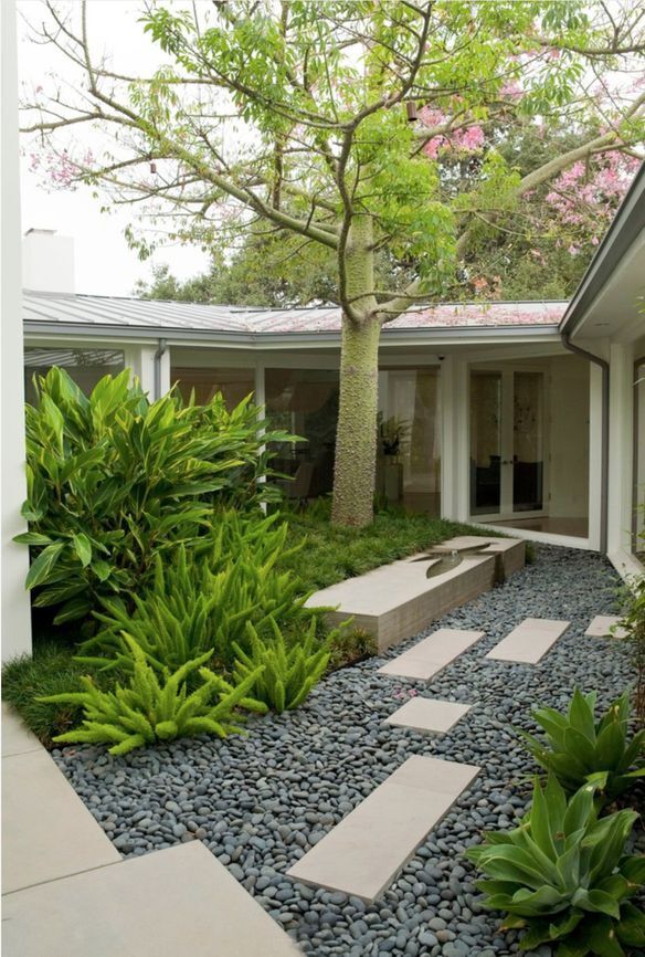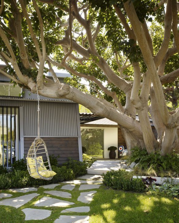 Это огромное 80-летнее коралловое дерево ( Erythrina ) в округе Ориндж, штат Калифорния, находилось в запущенном состоянии до того, как нынешние владельцы купили его. Чтобы сохранить свою красоту, дерево требует ежеквартальной обработки и шнуровки арбористом. Под ними высаживают простые в уходе папоротники. Настоящей достопримечательностью двора, разработанной Halo Interior Design , является подвесное кресло , которое привлекает внимание к этим скульптурным ветвям. Под стулом и ветками лежат неравномерные сланцевые брусчатки и трава.