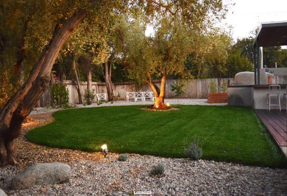 Зрелые оливковые деревья на этом заднем дворе в Лос-Анджелесе окружены гравием и толстым ковром из газона, а также мелким гравием для отличного дренажа. Двор, спроектированный Garden of Eva, заполнен засухоустойчивыми растениями и ландшафтом. Деревья страдают от засухи, и владельцы часто не поливают их, думая, что укоренившиеся экземпляры выживут. Молодые деревья следует поливать два раза в неделю, в то время как укоренившиеся деревья следует поливать непосредственно под листвой и кроной. Кроме того, примените мульчу, чтобы сохранить столь необходимую влагу.