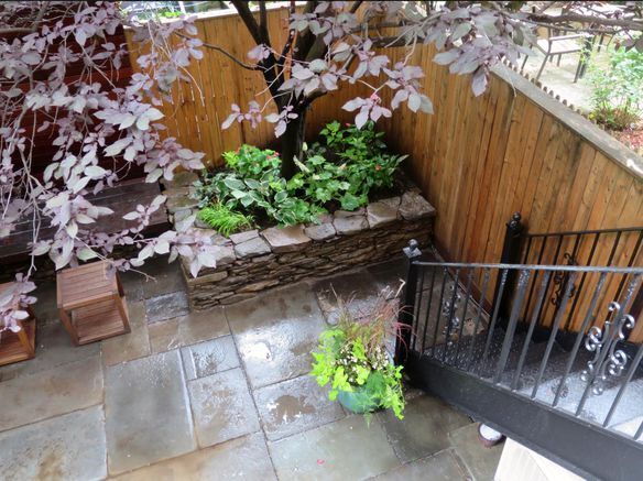 В углу вымощенного камнем двора в Бруклине взрослая слива дает тень и сезонный цвет. Компания Flo's Gardens спроектировала невысокую каменную приподнятую грядку с деревом, засаженным теневыносливыми хостами и петардой St. Огонь Эльмо».