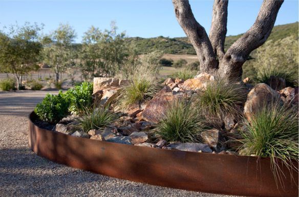 Окантовка кашпо из стали Corten в деревенском стиле поддерживает приподнятую грядку, на которой расположено центральное многоствольное оливковое дерево, а также различные местные камни и скалы. Другие растения включают осоку и Sedum spectabile 'Autumn Joy'. вместе с родными травами. Дом, спроектированный Carson Douglas Landscape Architecture , находится в Альпах, штат Калифорния, внутри страны, в Сан-Диего.