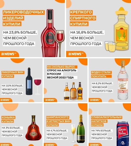 По данным Росалкогольрегулирования, в первом полугодии 2022 года в РФ продали 549 млн литров крепкого алкоголя, что на 42 млн больше, чем за тот же период 2021-го, и на 44 млн больше, чем за полугодие 2020-го. Таким образом, только за последний год повышение спроса на крепкое спиртное составило 8,3%.