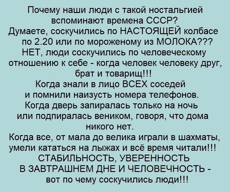 P.S. Что ещё интересно: иногда возникает впечатление, что в СССР не было вообще ничего, кроме уверенности в завтрашнем дне. На какой бы недостаток в советской системе я не указывал (а что они были, знала даже советская пресса), наиболее радикальным контраргументом было "зато была уверенность в завтрашнем дне!".