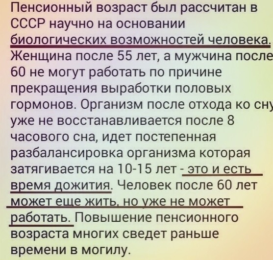 Сравните ради интереса среднюю продолжительность жизни в СССР на момент установки этого самого возраста, 55 и 60 лет, и сравните её со средней продолжительностью жизни в современной России... Хотя, по идее, продолжительность жизни тоже впрямую связана с биологическими возможностями.