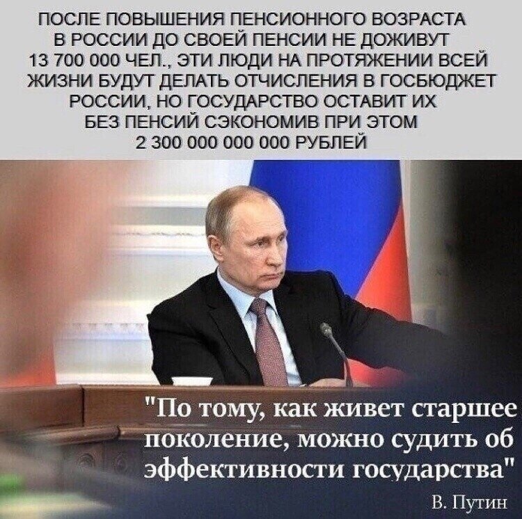 До принятия пенсионной реформы Голикова и Силуанов мололи языками, что надо повысить пенсионный возраст, чтоб поднять пенсии. Возраст повысили, а пенсии остались такими же. Т. е денежки пенсионные попросту украли, хотя даже по воровским понятиям воровать у пенсионеров западло.