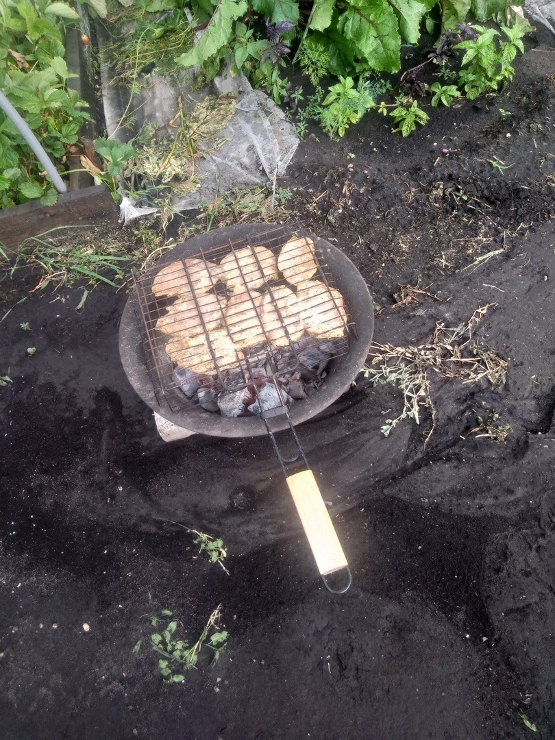 Наконец-то дожили до выходных... После такой адской жары, решили устроить пикник... Замариновали мяско, и пошли на сад-огород, чтобы предаться 😁 полезному отдыху. Пока собирала ягодки, рвала зелень на стол ( между делом пропалывая грядки), муж разжег мангал.