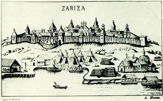 Есть версия, что изначальным названием было даже не Царицын, а именно Царица, что можно найти в наиболее старых планах и зарисовках — Zariza — так он обозначен. Располагался же он на острове, расположенном посередине реки с одноименным названием Царица — сегодня она уже полностью пересохла и только овраг проходящий через город напоминает о бывших границах ее русла.