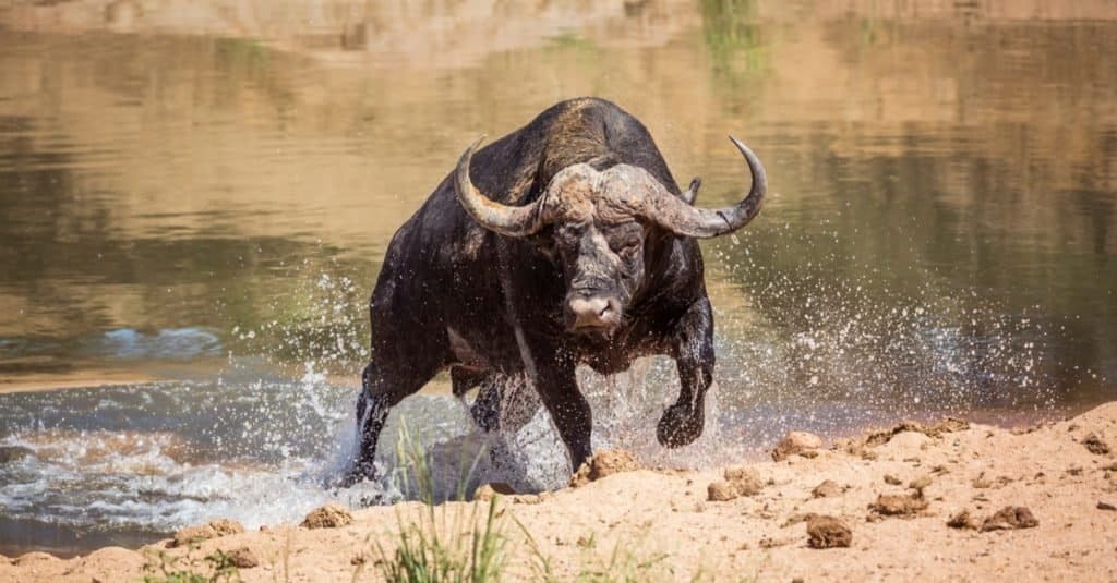 Когда капские буйволы чувствуют себя хоть немного загнанными в угол или будто им угрожает опасность, они становятся буйными маньяками. Своими рогами они уничтожат все на своем пути. Они будут быстро сражаться, чтобы защитить себя или ближайших телят, даже если они не свои.