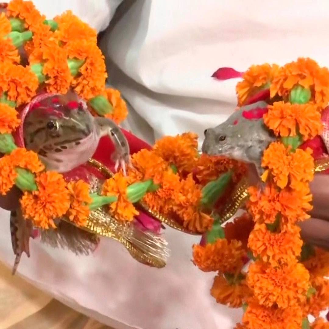 В Индии страдающие от жары и засухи жители устроили свадьбу двух лягушек, чтобы вызвать дождь.