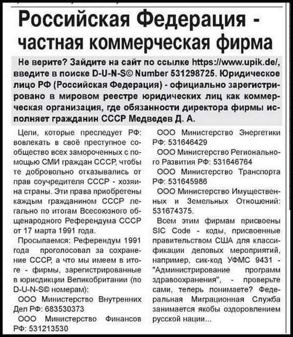 &t=317sЯ слышала об этом, даже статью написала: Говорят, что Россия - колония, корпорация, частная (коммерческая) фирма, а вы что думаете по этому поводу?www.9111.ru