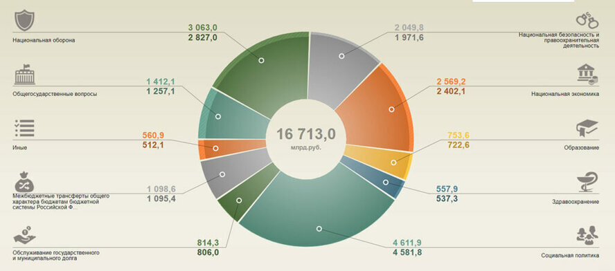 Основная часть денег из Российского бюджета уходит военным и полиции. Остальное на пенсии. На экономику страны выделено крайне мало денежных средств.