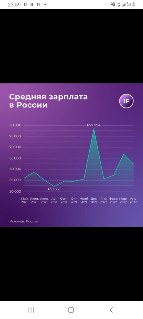 Из источника Росстат средняя зарплата в России в 2022 достигает 62 269 руб. Приятные цифры и отложить даже получиться. Но на деле спрашивая своих знакомых сколько зарабатывают: 25.000 руб. - 30.000 руб, один только из полиции друг 40.000 руб. Данное значение очень грубое. Кто-то работает начальником, кто-то рабочим.Так же в Москве будут зарплаты выше, чем в других городах России.