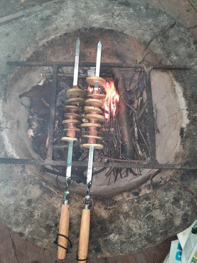 Мы жарили сосиски и кружочки кабачков. Всё делала дочка сама. Костёр разводила, собирала сухие ветки... Шампуры у нас свои, давно купили и берём всегда со собой.