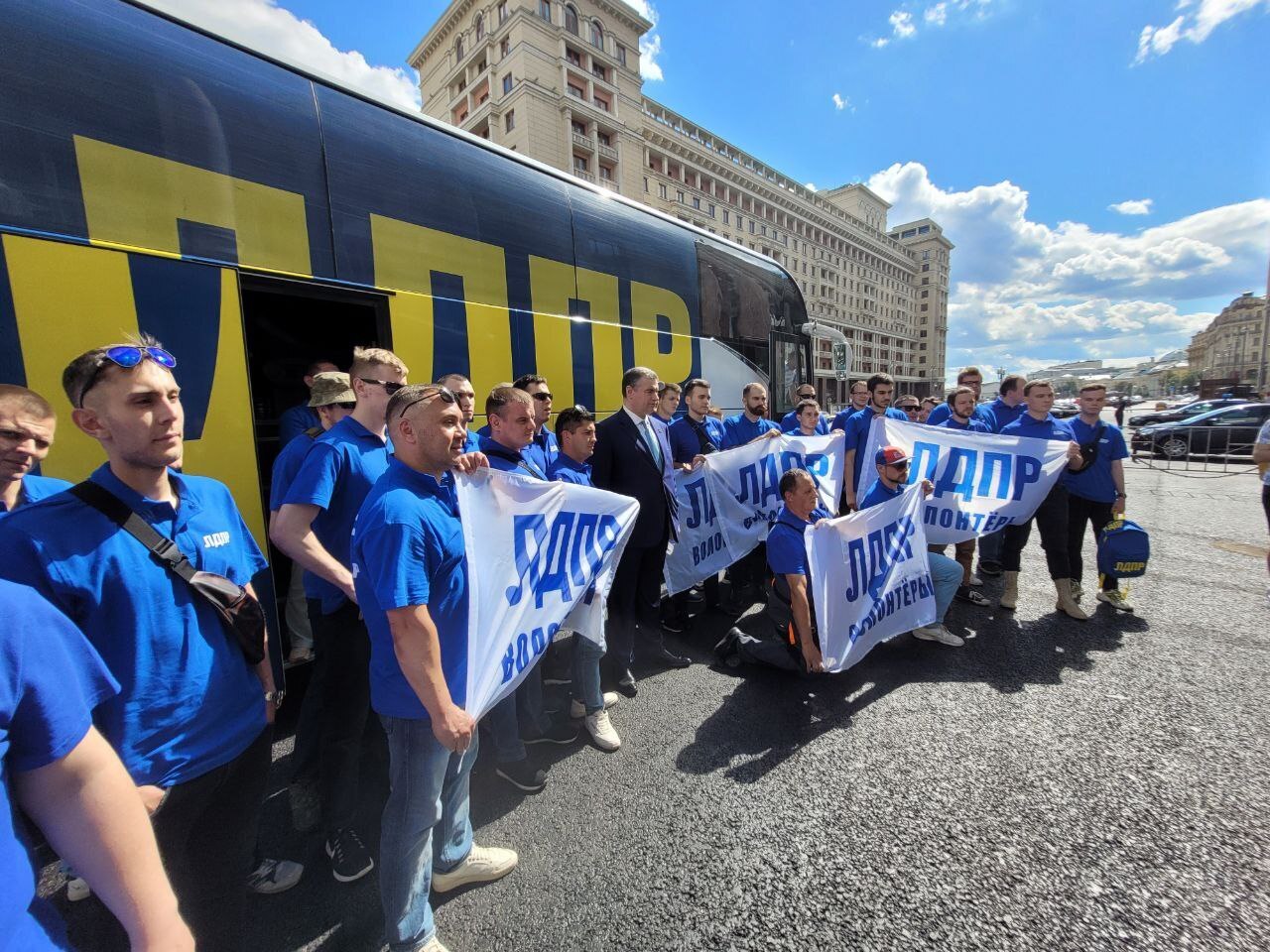 Председатель ЛДПР Леонид Слуцкий выступил перед волонтёрами второго десанта ЛДПР в Донецкую Республику. Он рассказал о предстоящем референдуме, задачах волонтёрского корпуса в народных республиках и поблагодарил добровольцев за милосердие и готовность помогать жителям Донбасса.