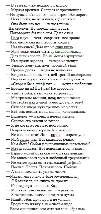 — Мною можно запугивать крестьян, оправдывать милитаризм, инфляцию и неудачи в экономике. И я отлично справляюсь с устранением претендентов на трон. Поверь, твой папа таки ценит меня гораздо больше, чем тебя. Именно поэтому на Новый Год, Пасху и День Труда он присылает мне сто быков, сто баранов, бочку вина и двух девственниц.Ах какие это женщины...цимес мит компот..
